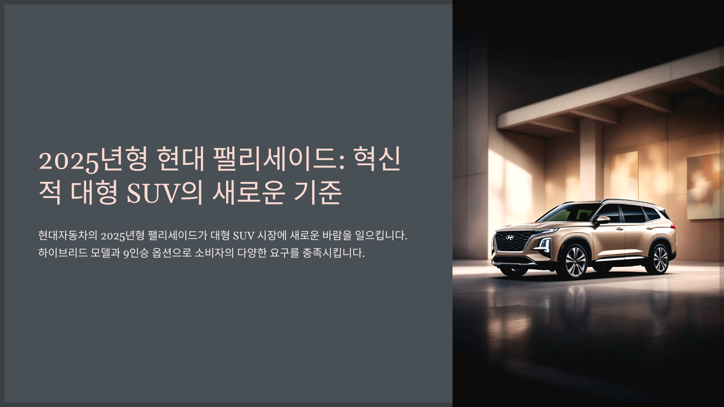 대형 SUV 구매를 고려하고 계시는가요? 경제성과 넉넉한 실내 공간을 모두 포기하고 싶지 않은 분들에게 현대자동차의 2025년형 팰리세이드는 완벽한 선택이 될 수 있습니다. 이번 글에서는 새롭게 추가된 하이브리드 모델과 9인승 옵션 등 신형 팰리세이드의 주요 특징을 자세히 살펴보겠습니다.